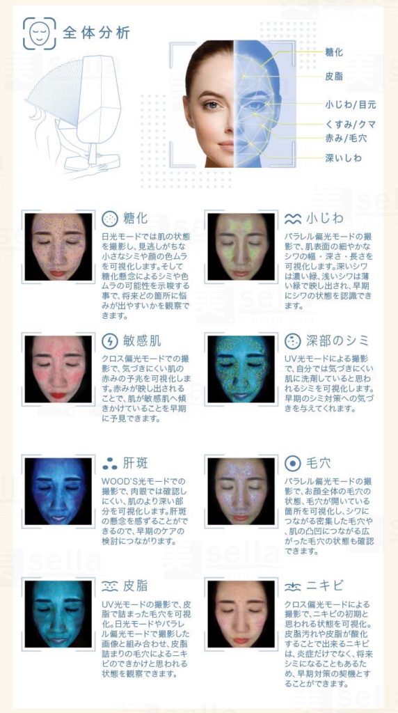 肌の水分量、油分、キメ、毛穴の状態、シミやシワの傾向などを正確に分析します。